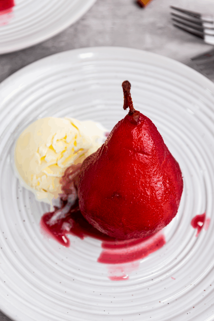 An interesting thing about red wine poached pears is how the color develops. Pears don’t just absorb the wine on the surface. As they gently simmer, the pigments from the red wine slowly move inward, creating that dramatic ruby-to-blush gradient. It’s why pears poached in wine look so elegant without any extra effort. Another fun detail is that this dessert actually improves with time.